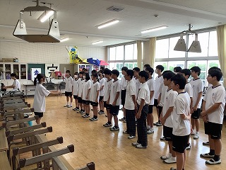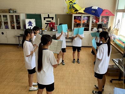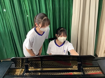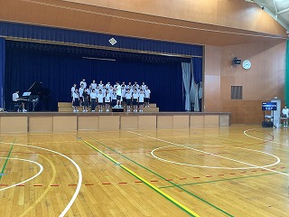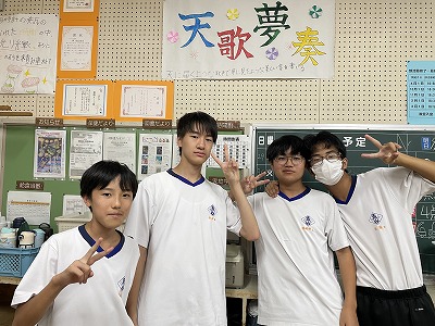 「この地球のどこかで」を合唱します。音程の難しい所、他のパートに引きずられてしまう所などを、指揮者・伴奏者・バートリーダーを中心に励まし合いながら練習を積み重ねてきました。他の学級の歌声を聞き、手応えや金賞への願望が大きくなった生徒もいます。新しい課題に気付いた生徒もいます。しかし、慢心や焦りは禁物です。次は、縦割り青チームのみなさんと合唱を披露し合います。コンクールに向けてしっかり仕上げていきましょう。