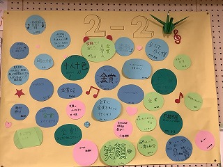 私たちの学級の目標は「みんなのそれぞれがもっている色(個性)が綺麗に混ざり合う(協力や団結ができる)クラスを目指す」です。青山祭の合唱コンクールに向けて練習に励んでいるところです。