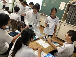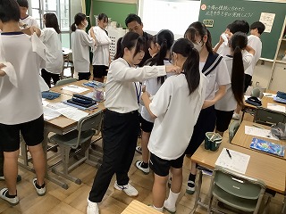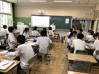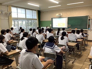 がんについての正しい理解をし、がんと向き合う人に対して共感的に考えることを目的に、がん教育が行われました。直腸がんを例にして具体的に指導していただきました。そして、話し合い活動も意欲的に取り組むことができました。家族などに検診を勧めるとき、今回の学んだ知識を伝えたり、相手の気持ちになって話をしたりしていきたいという意見の発表がありました。