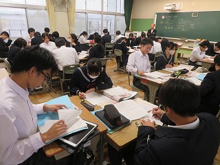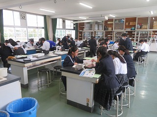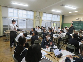 10月31日(金)の4時間目の様子です。先生の話を聞いている場面、グループで相談する場面、生徒が発表している場面、実験後のまとめをしている場面など様々な授業の様子をみることができました。